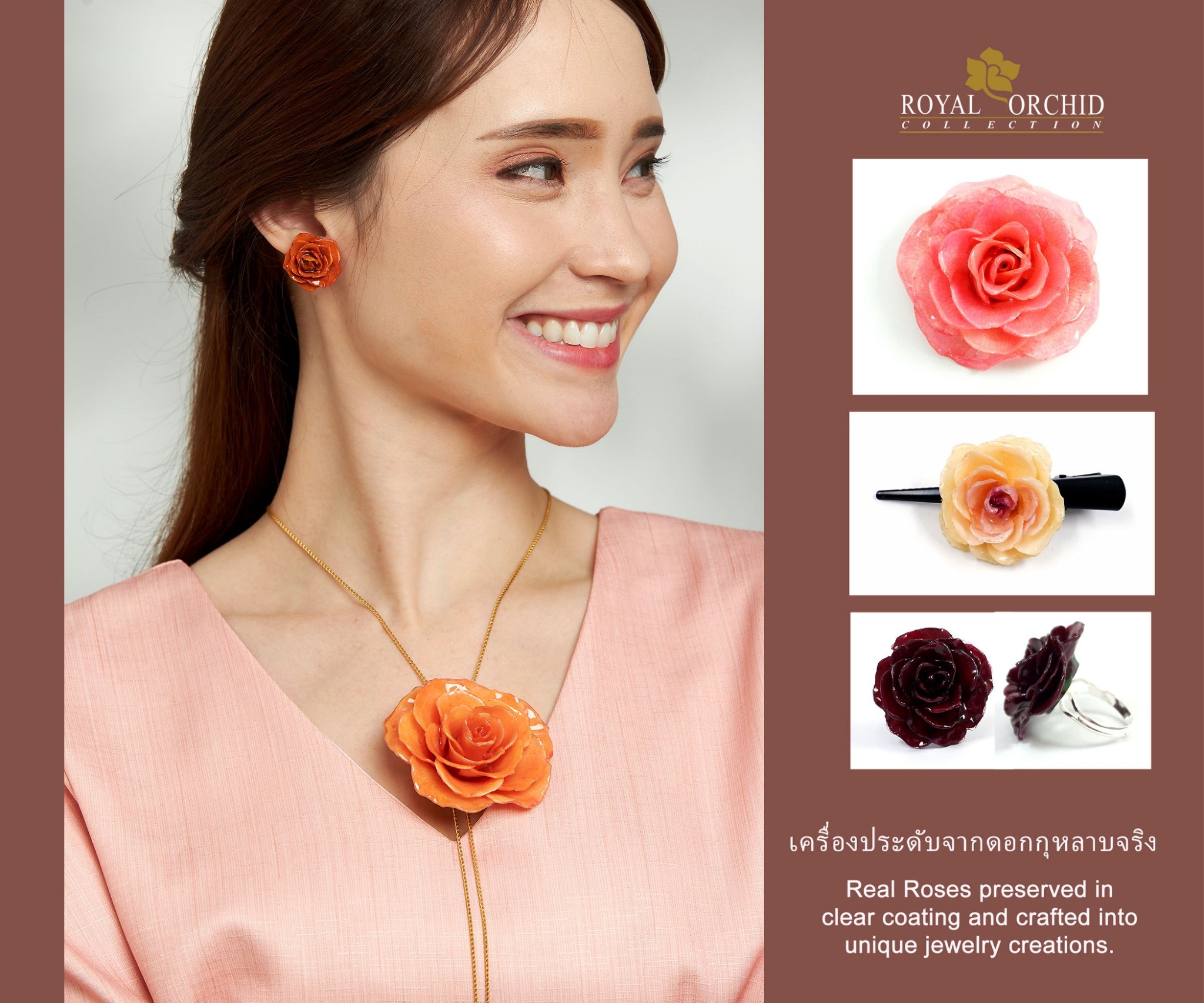 นับตั้งแต่เริ่มก่อตั้งในปี พ.ศ. 2521 บริษัทสยามรอยัลออคิด จำกัด ได้สร้างสรรค์เครื่องประดับสุดพิเศษที่ได้รับแรงบันดาลใจจากธรรมชาติ ด้วยวัสดุธรรมชาติ ดอกไม้ ใบไม้ เมล็ด และ กิ่งไม้จริง ผ่านการคัดสรรค์ เก็บรักษาไว้อย่างพิถีพิถัน สร้างสรรค์เป็นเครื่องประดับที่มีเอกลักษณ์โดยช่างฝีมือ